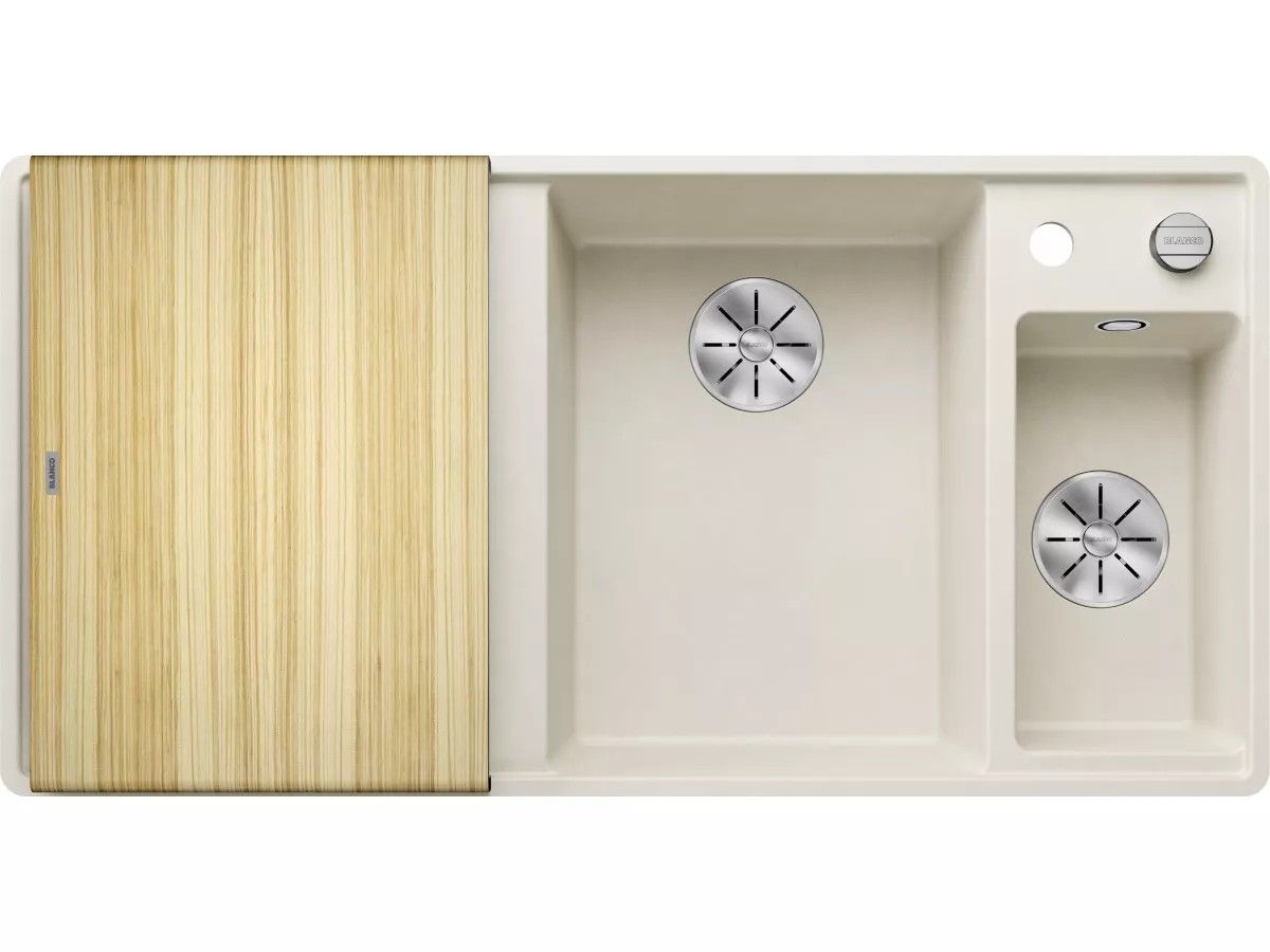BLANCO AXIA III 6 S-F Silgranit Zlewozmywak 99x50 cm komora prawa, korek auto., InFino, deska jesionowa, odsączarka stalowa delikatny biały mat 527050