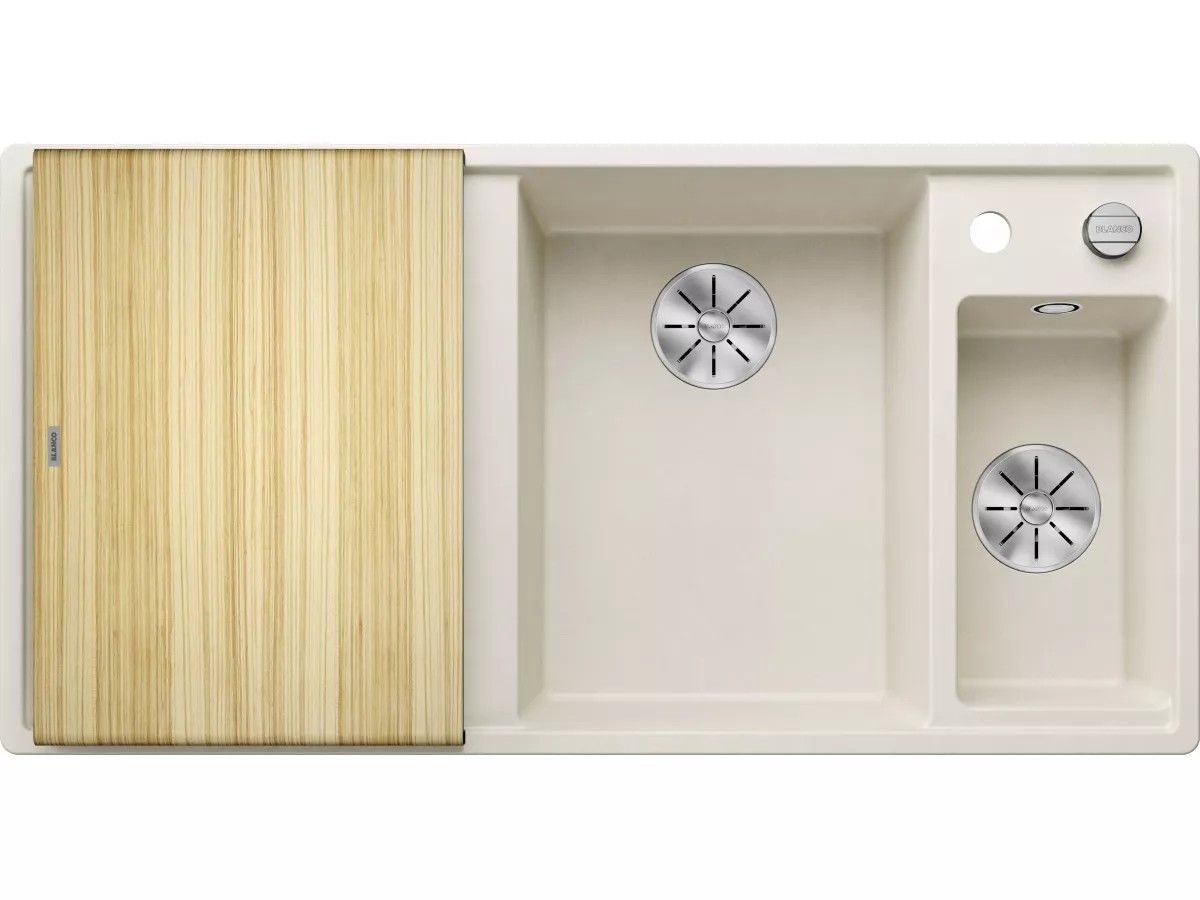 BLANCO AXIA III 6 S Silgranit Zlewozmywak 100x51 cm komora prawa, korek auto., InFino, deska jesionowa, odsączarka stalowa delikatny biały 527046