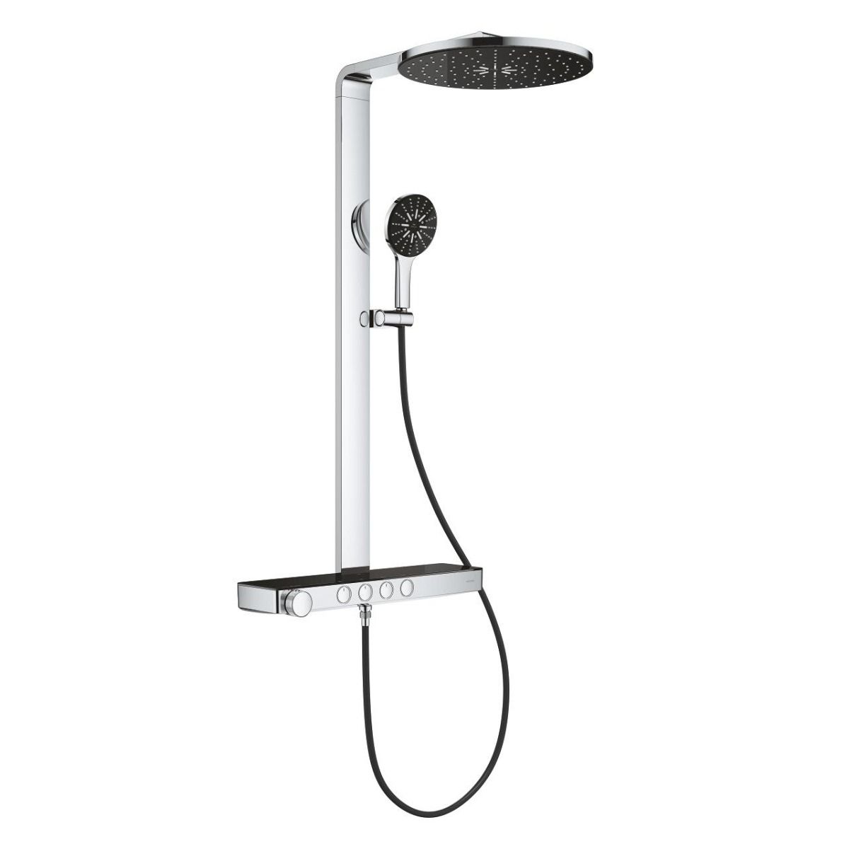 Najważniejsze cechy i zalety GROHE- Rainshower Aqua Pure System prysznicowy z termostatem do montażu ściennego czarny / chrom 100964KI00