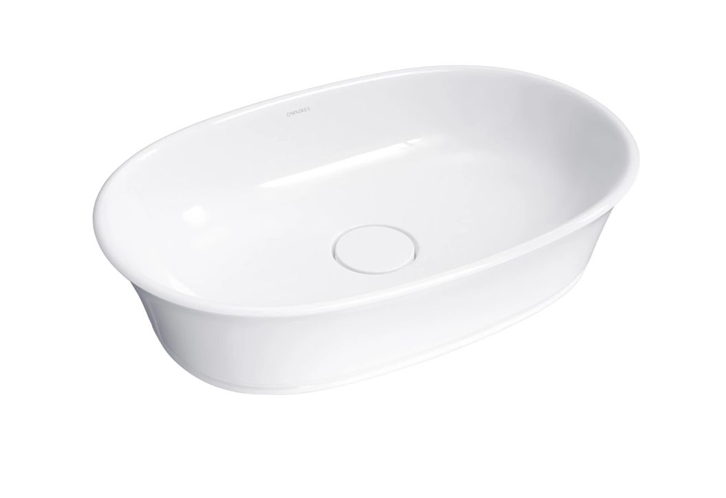 Umywalka nablatowa OMNIRES CLASSICA 61 x 40 cm w kolorze biały połysk. Klasyczny, owalny kształt z delikatnym rantem, materiał M+, maskownica odpływu w zestawie.