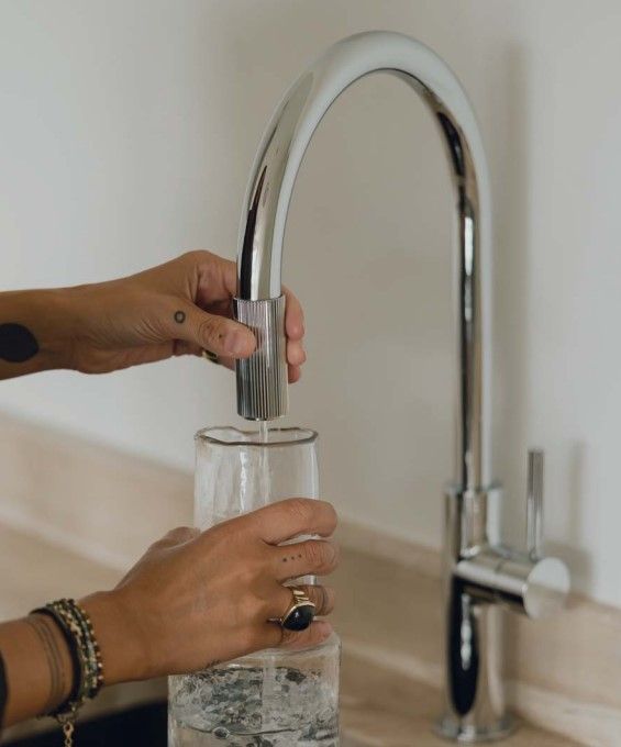 Seria SWITCH została zaprojektowana tak, aby jedna bateria mogła spełniać kilka funkcji jednocześnie. Klasyczny mieszacz odpowiada za wodę ciepłą i zimną, natomiast specjalny pierścień na końcu wylewki uruchamia strumień wody filtrowanej. Wystarczy delikatnie przekręcić pierścień, aby napełnić szklankę lub dzbanek czystą wodą pitną.