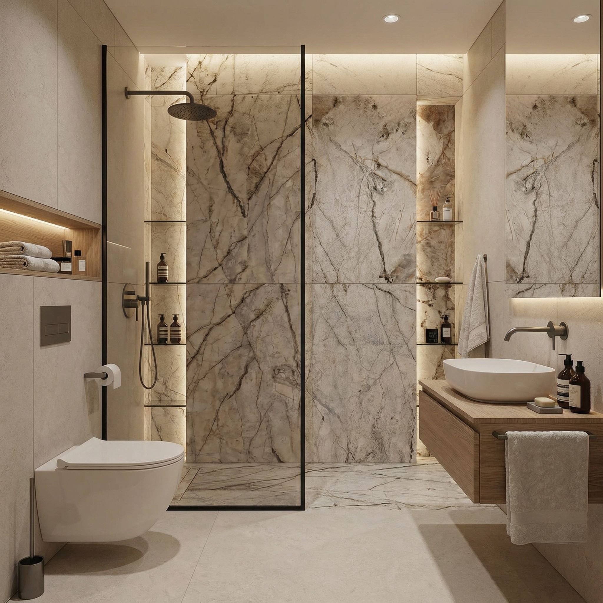 Jeśli zależy Ci na łazience łatwej do utrzymania w czystości i spokojnej wizualnie, najbezpieczniejszym wyborem będzie prosta zabudowa ściany, ograniczenie liczby otwartych półek oraz przeniesienie przechowywania do mebli. W praktyce to właśnie takie rozwiązania najlepiej sprawdzają się po kilku latach użytkowania.