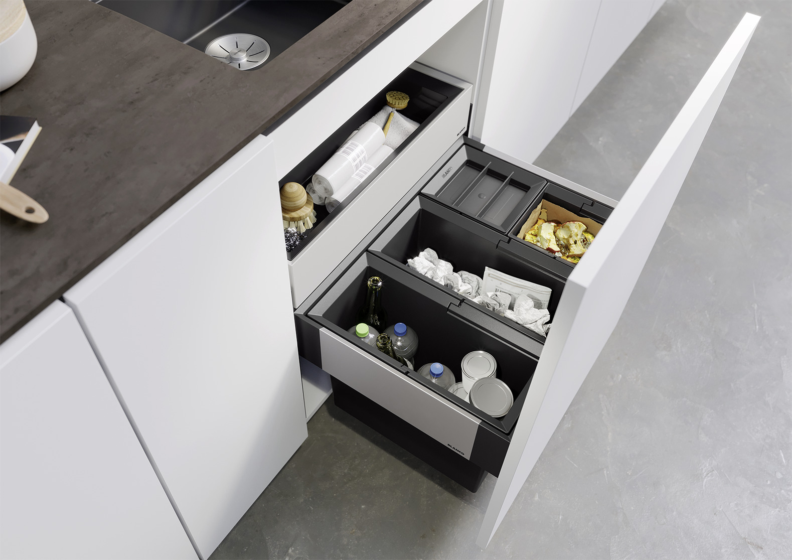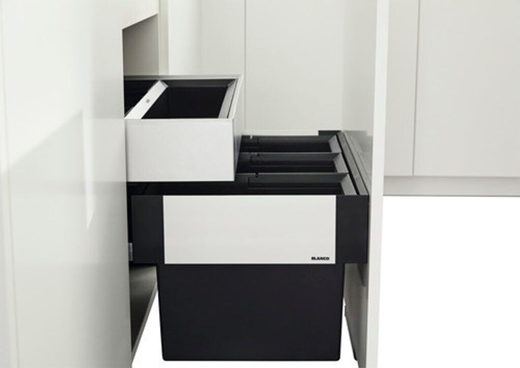 Dla jeszcze lepszej organizacji warto rozważyć szufladę organizacyjną BLANCO SELECT II . Pozwala ona przechowywać worki, środki czystości lub akcesoria bezpośrednio nad pojemnikami.